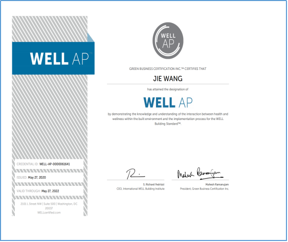WELL AP是由美國IWBI機構頒發有官方簽名的認證證書,持有者同時獲得認證資質,并納入全球人才庫當中。WELL認證項目成員具有WELL AP可加1分。